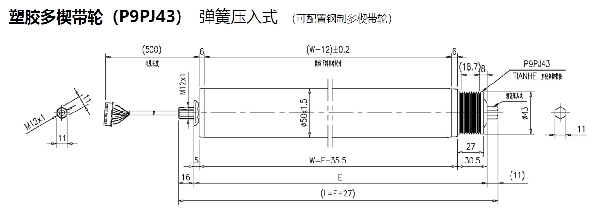 電動輥筒 塑膠多楔帶輪(P9PJ43) 彈簧壓入式 (可配置鋼制多楔帶輪)